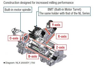 The Spindle is loaded with tool holders and cutters to achieve the proper material removal. There are many different styles of tool holders including BT and CAT – which have a conical shape as well as HSK, which uses flanges instead of a taper to lock the holder in place. BT and CAT Holders can come in various sizes including 30, 40 and 50 taper depending on the size of tool the cutter requires. HSK (Hollow taper ShanK) comes in a variety of types – A through F – and sizes from HSK-32 up to HSK-160. HSK is considered a better tool holder for high speed machining as there is more surface contact between the spindle and the holder, reducing vibration and keeping the tool from pulling back into the receiver when cutting at high speeds.